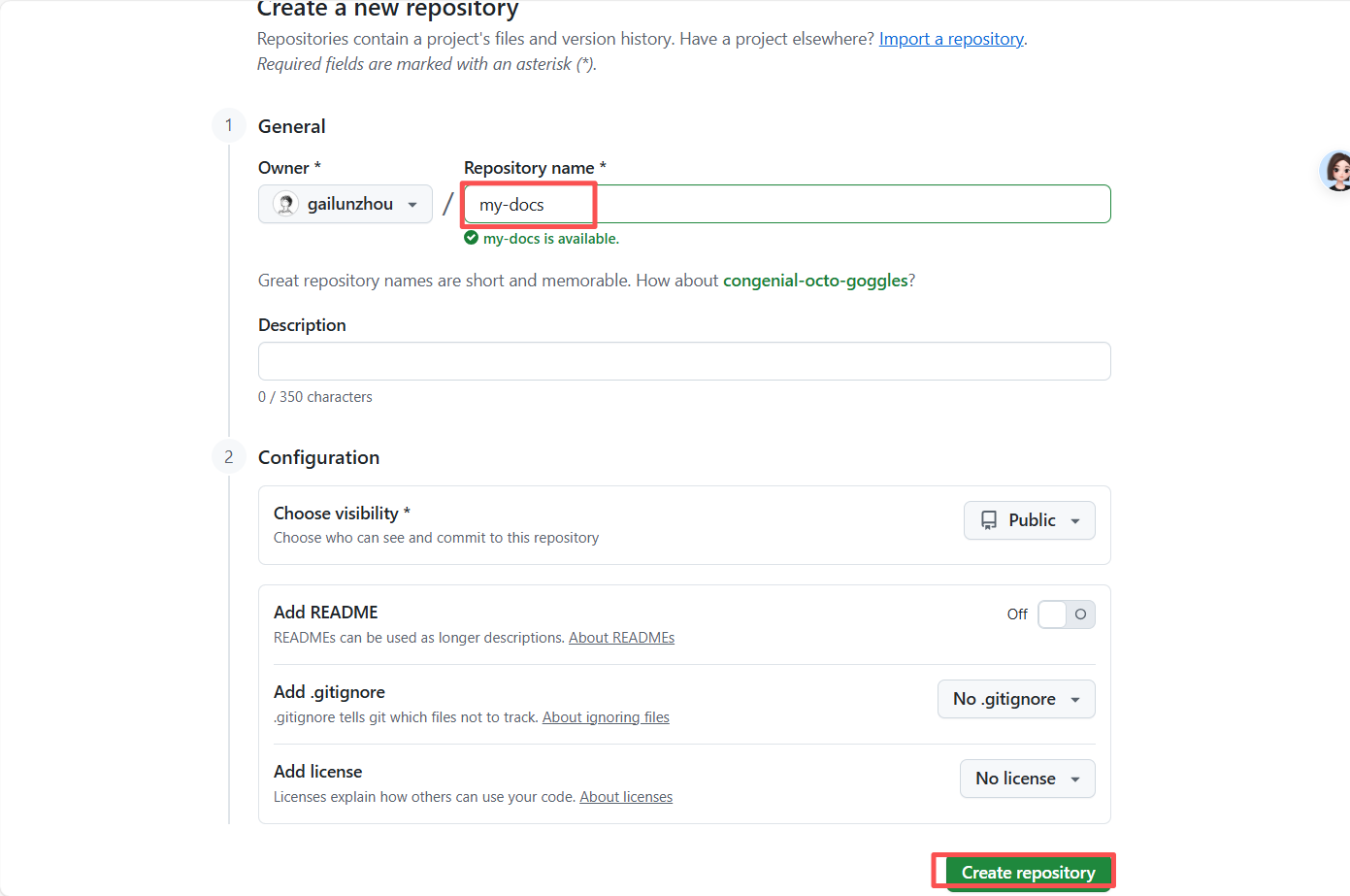 - 登录 GitHub,创建一个公开仓库(仓库名建议与本地项目名一致,假设你的文件夹名称还是my-docs)
