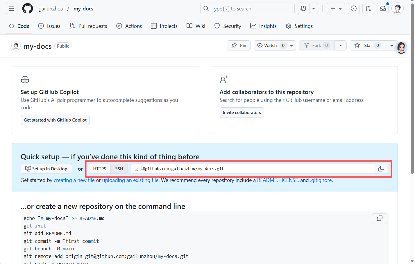 - 复制仓库的 HTTPS 地址或SSH地址(如 https://github.com/your-username/my-docs.git (HTTPS地址))