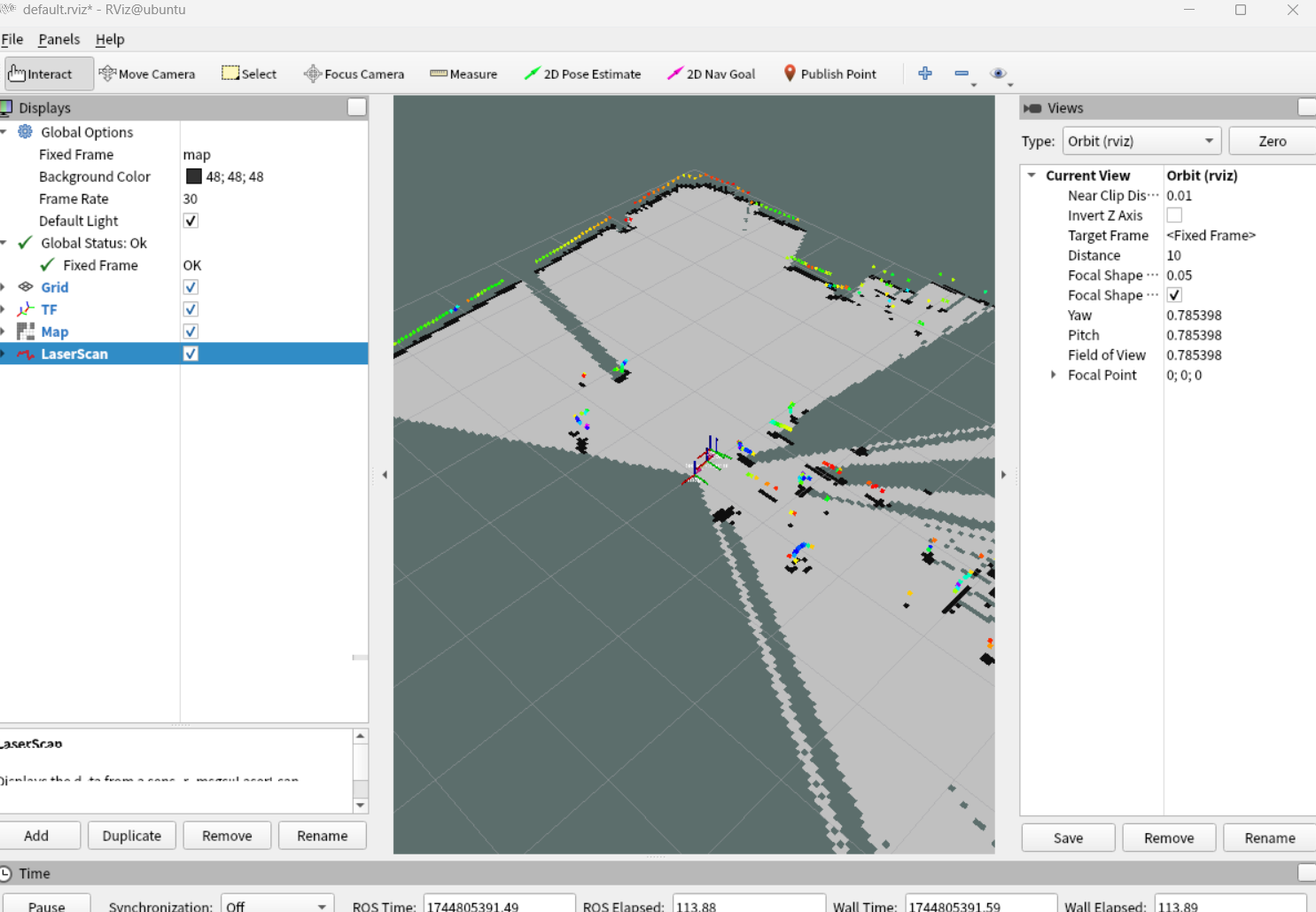 - 在rviz中添加map,TF,laserscan组件,将