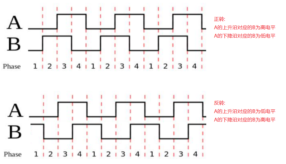 A相、B相为相互延迟1/4周期的脉冲输出,根据延迟关系可以区别正反转,而且通过取A相、B相的上升和下降沿可以进行单频或2倍频或4倍频测速