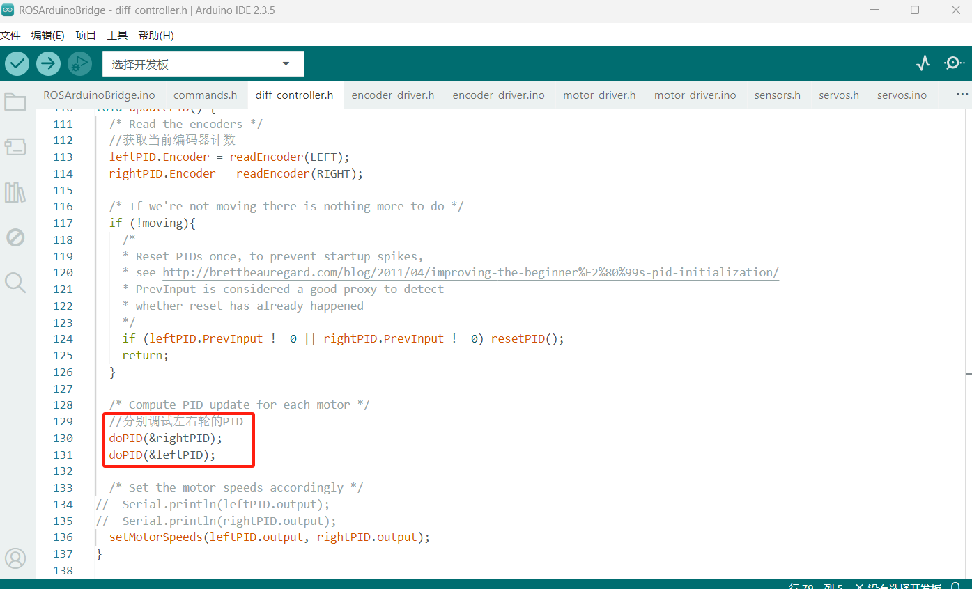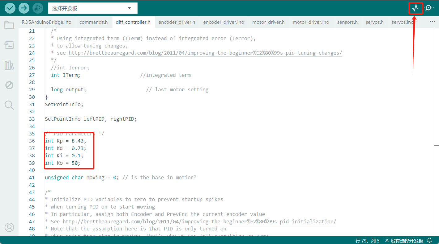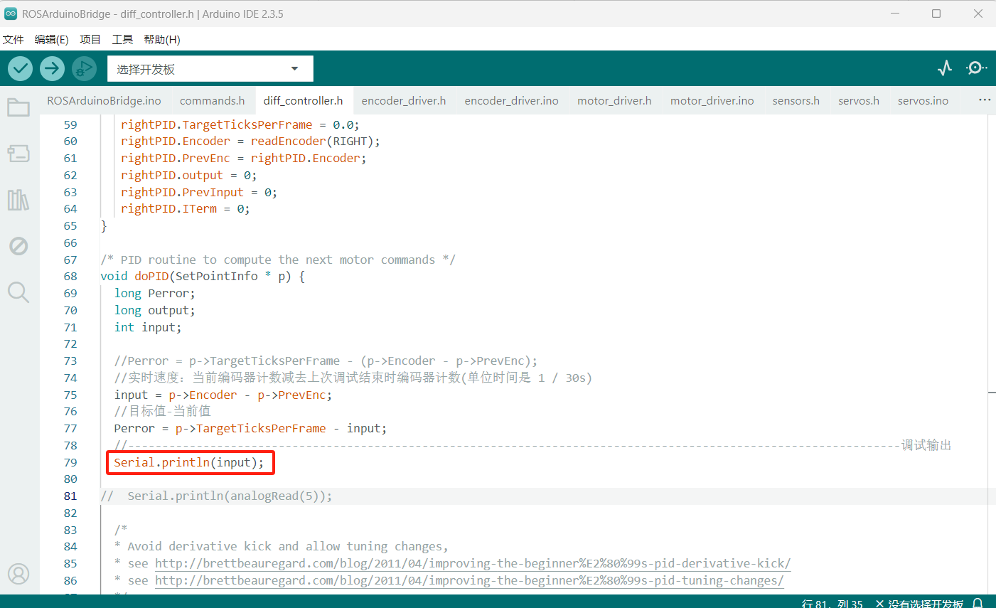 调试PID需要把当前的PWM值输出出来,PID部分的代码在diff_controller.h中