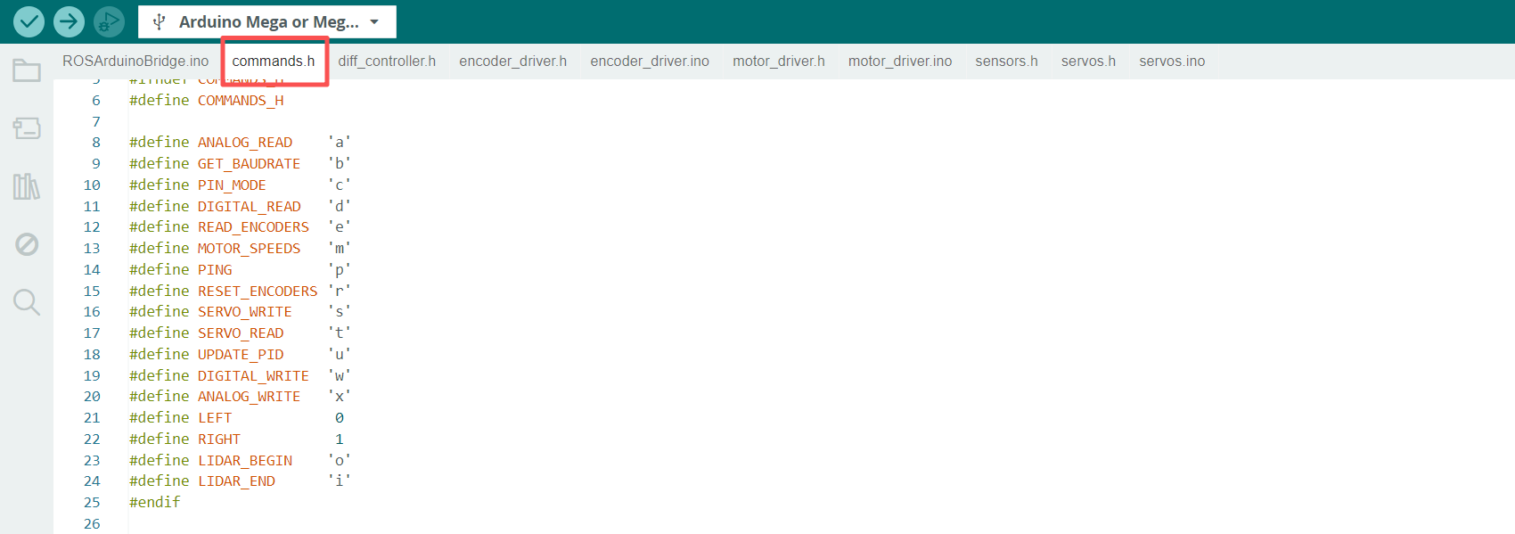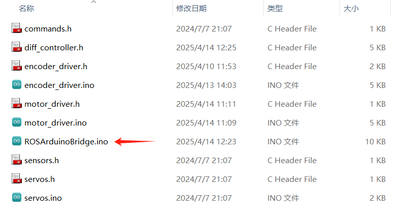 下的 RosArduinoBridge.ino 是Arduino端程序的主入口