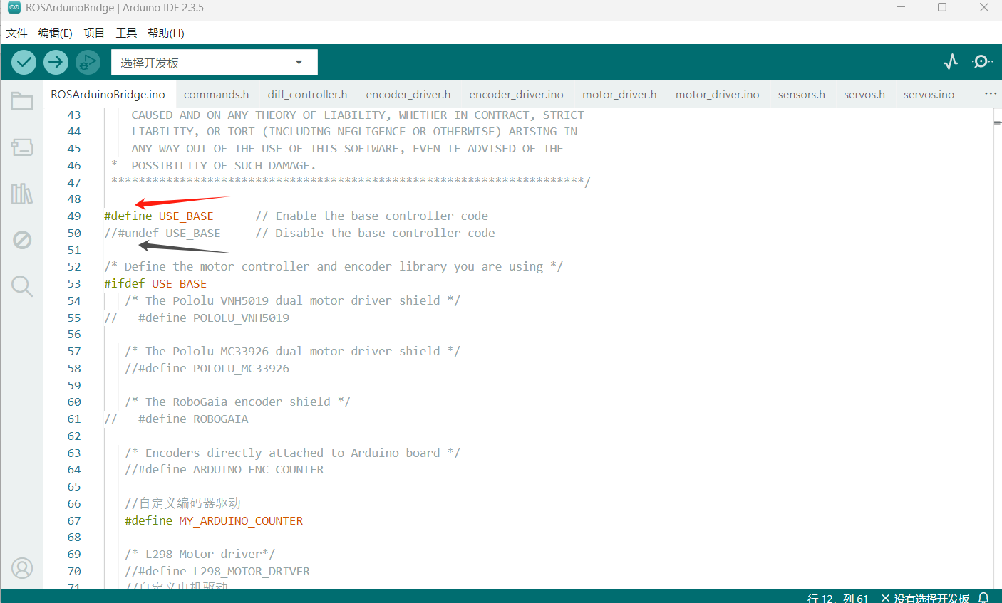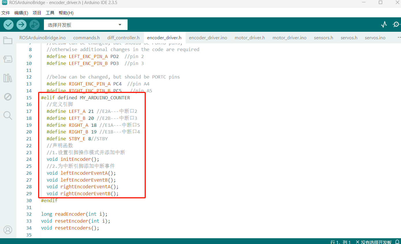 在RosArduinoBridge.ino中增加自定义的编码器驱动